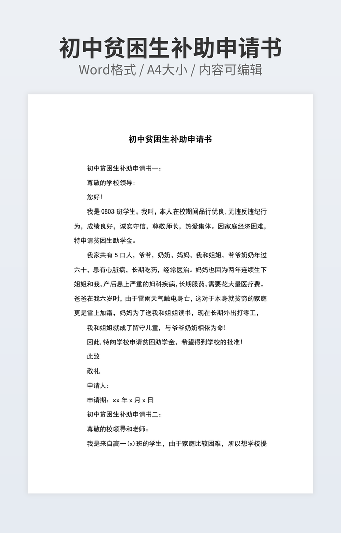 初中贫困生补助申请书