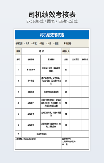 本作品内容为成品库仓管员绩效考核表Excel表格下载,大小为17.87KB,作品为高清大图模板,格式为xlsx, 属于绩效考核模板,作品模板源文件下载后可用编辑替换,模板中如有人物画像仅供参考禁止商用。小Q办公网-提供简历,PPT,Word,Excel优质模板素材下载模版平台,拥有海量的工作总结、竞聘求职、年终颁奖、计划书等。 通过小Q办公网下载绩效考核模板源文件编辑修改源文件文字和图片即可使用。