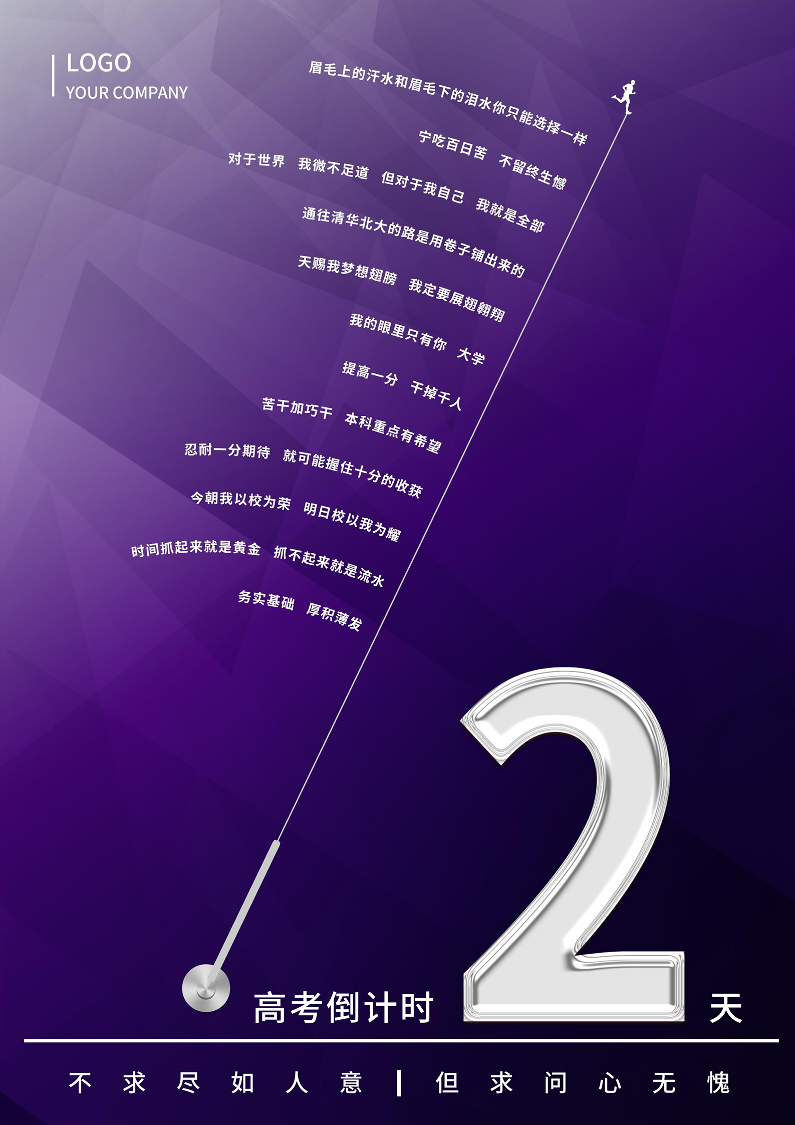 【特殊限制】设计师仅对作品中独创性部分享有著作权,对作品中含有的国旗、国徽等政治图案不享有权利,仅作为作品整体效果的示例展示,禁止商用。 相关关键词: 紫色 简约风 高考 倒计时 海报 考试 学生 学习