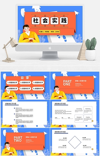 蓝色插画风暑期实践PPT模板