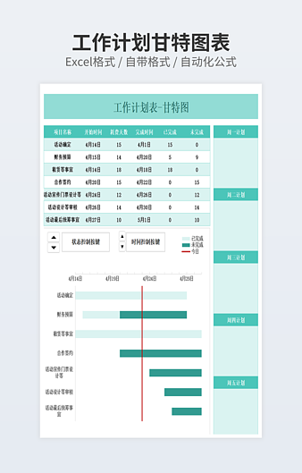 本作品内容为工作自动计算计划表甘特图下载,大小为22.13KB,作品为高清大图模板,格式为xlsx, 属于甘特图模板,作品模板源文件下载后可用编辑替换,模板中如有人物画像仅供参考禁止商用。小Q办公网-提供简历,PPT,Word,Excel优质模板素材下载模版平台,拥有海量的工作总结、竞聘求职、年终颁奖、计划书等。 通过小Q办公网下载甘特图模板源文件编辑修改源文件文字和图片即可使用。