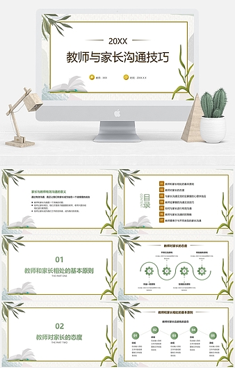 【特殊限制】设计师仅对作品中独创性部分享有著作权,对作品中含有的国旗、国徽等政治图案不享有权利,仅作为作品整体效果的示例展示,禁止商用。 相关关键词: 清新 教师 家长 沟通 技巧 PPT 模板
