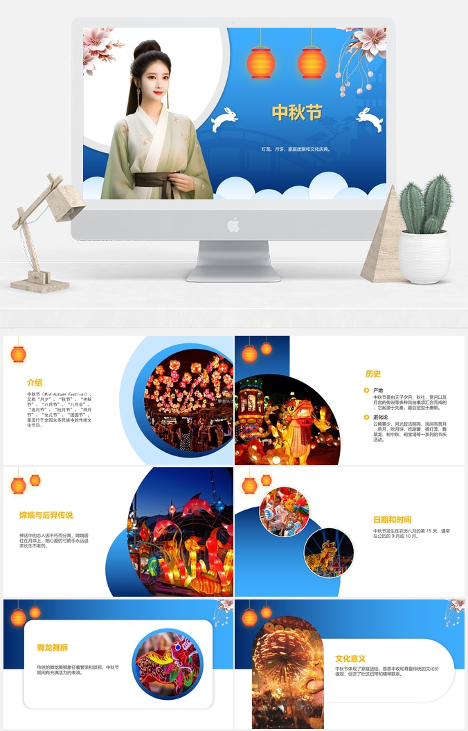本作品内容为蓝色卡通传统节日中秋节PPT模板下载,大小为65.16MB,作品为高清大图模板,格式为pptx, 属于中秋节模板,作品模板源文件下载后可用编辑替换,模板中如有人物画像仅供参考禁止商用。小Q办公网-提供简历,PPT,Word,Excel优质模板素材下载模版平台,拥有海量的工作总结、竞聘求职、年终颁奖、计划书等。 通过小Q办公网下载中秋节模板源文件编辑修改源文件文字和图片即可使用。