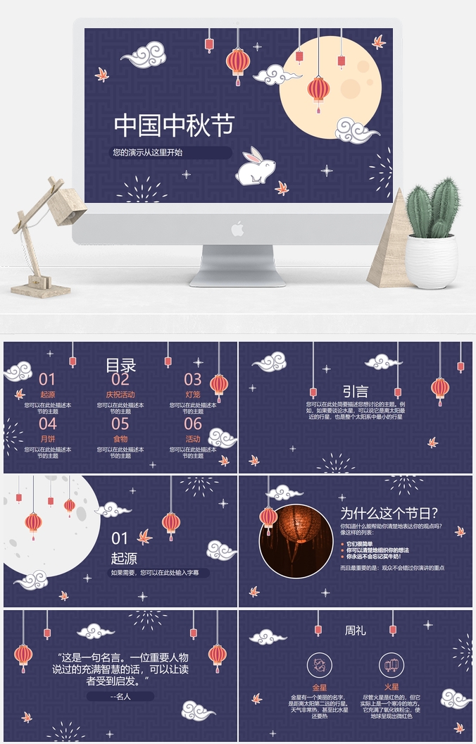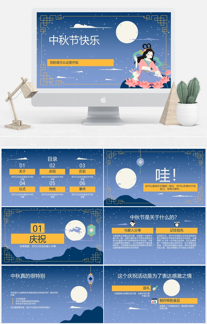 【特殊限制】设计师仅对作品中独创性部分享有著作权,对作品中含有的国旗、国徽等政治图案不享有权利,仅作为作品整体效果的示例展示,禁止商用。 相关关键词: 蓝色 卡通 传统节日 中秋节 PPT 模板