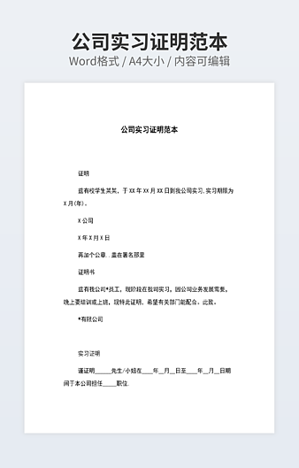 本作品内容为学生暑假公司实习证明下载,大小为33.64KB,作品为高清大图模板,格式为docx, 属于证明文件模板,作品模板源文件下载后可用编辑替换,模板中如有人物画像仅供参考禁止商用。小Q办公网-提供简历,PPT,Word,Excel优质模板素材下载模版平台,拥有海量的工作总结、竞聘求职、年终颁奖、计划书等。 通过小Q办公网下载证明文件模板源文件编辑修改源文件文字和图片即可使用。