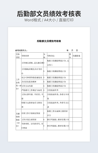 本作品内容为医院绩效考核标表格下载,大小为66.71KB,作品为高清大图模板,格式为xlsx, 属于常用表格模板,作品模板源文件下载后可用编辑替换,模板中如有人物画像仅供参考禁止商用。小Q办公网-提供简历,PPT,Word,Excel优质模板素材下载模版平台,拥有海量的工作总结、竞聘求职、年终颁奖、计划书等。 通过小Q办公网下载常用表格模板源文件编辑修改源文件文字和图片即可使用。