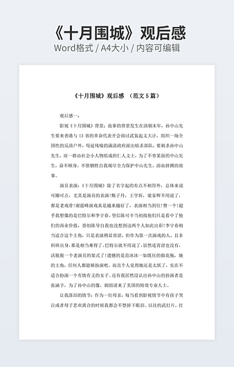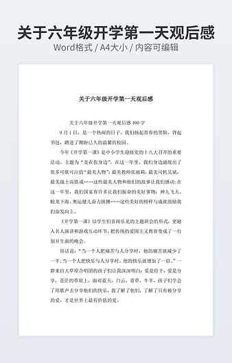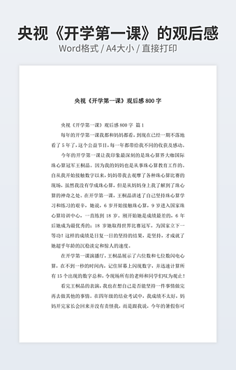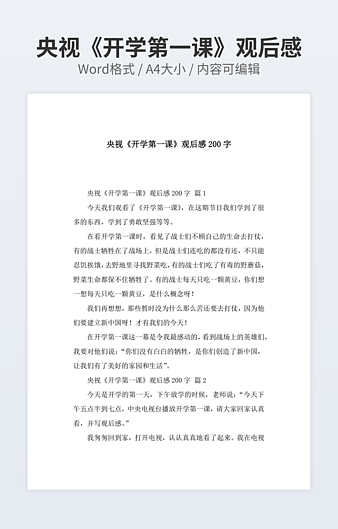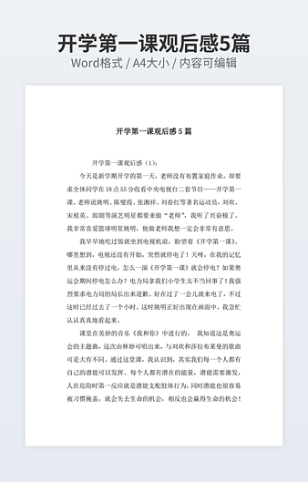 本作品内容为学生开学第一课的观后感下载,大小为18.62KB,作品为高清大图模板,格式为docx, 属于观后感模板,作品模板源文件下载后可用编辑替换,模板中如有人物画像仅供参考禁止商用。小Q办公网-提供简历,PPT,Word,Excel优质模板素材下载模版平台,拥有海量的工作总结、竞聘求职、年终颁奖、计划书等。 通过小Q办公网下载观后感模板源文件编辑修改源文件文字和图片即可使用。