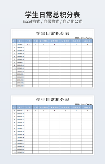 本作品内容为初中生上课点名积分表下载,大小为19.82KB,作品为高清大图模板,格式为xlsx, 属于学生积分表模板,作品模板源文件下载后可用编辑替换,模板中如有人物画像仅供参考禁止商用。小Q办公网-提供简历,PPT,Word,Excel优质模板素材下载模版平台,拥有海量的工作总结、竞聘求职、年终颁奖、计划书等。 通过小Q办公网下载学生积分表模板源文件编辑修改源文件文字和图片即可使用。