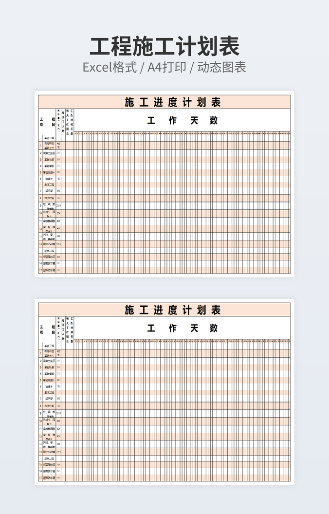 【特殊限制】设计师仅对作品中独创性部分享有著作权,对作品中含有的国旗、国徽等政治图案不享有权利,仅作为作品整体效果的示例展示,禁止商用。 相关关键词: 精简 工程施工 进度 计划表