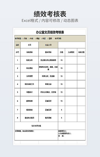 本作品内容为英语培训教师日常绩效考核表下载,大小为17.13KB,作品为高清大图模板,格式为xlsx, 属于绩效考核模板,作品模板源文件下载后可用编辑替换,模板中如有人物画像仅供参考禁止商用。小Q办公网-提供简历,PPT,Word,Excel优质模板素材下载模版平台,拥有海量的工作总结、竞聘求职、年终颁奖、计划书等。 通过小Q办公网下载绩效考核模板源文件编辑修改源文件文字和图片即可使用。