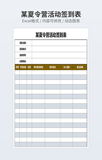 本作品内容为夏令营活动签到表下载,大小为10.65KB,作品为高清大图模板,格式为xlsx, 属于其他模板,作品模板源文件下载后可用编辑替换,模板中如有人物画像仅供参考禁止商用。小Q办公网-提供简历,PPT,Word,Excel优质模板素材下载模版平台,拥有海量的工作总结、竞聘求职、年终颁奖、计划书等。 通过小Q办公网下载其他模板源文件编辑修改源文件文字和图片即可使用。