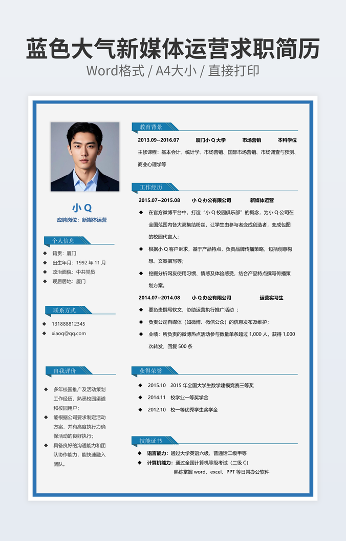 蓝色大气新媒体运营求职简历