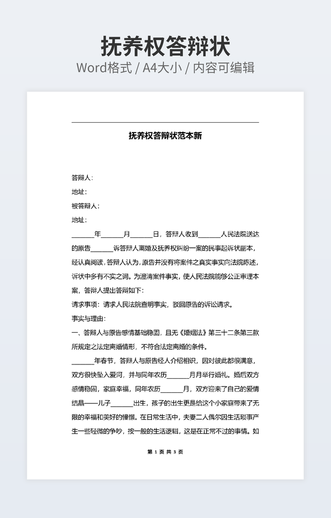 抚养权答辩状范本新