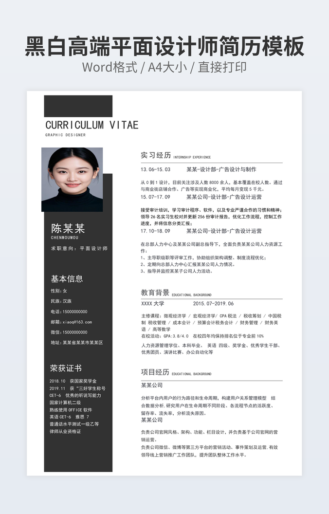 黑白高端平面设计师简历模板