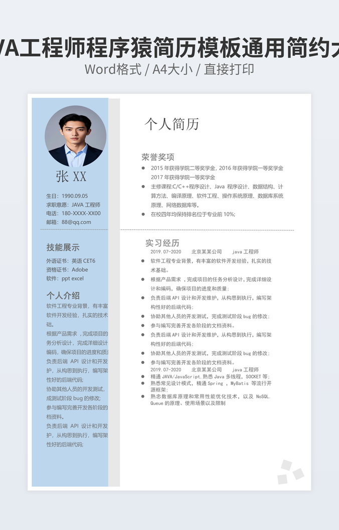 JAVA工程师程序猿简历模板通用简约大气
