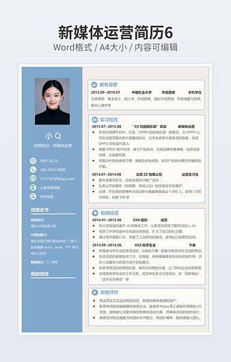 本作品内容为新媒体运营简历9下载,大小为122.95KB,作品为高清大图模板,格式为docx, 属于其他模板,作品模板源文件下载后可用编辑替换,模板中如有人物画像仅供参考禁止商用。小Q办公网-提供简历,PPT,Word,Excel优质模板素材下载模版平台,拥有海量的工作总结、竞聘求职、年终颁奖、计划书等。 通过小Q办公网下载其他模板源文件编辑修改源文件文字和图片即可使用。