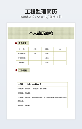 本作品内容为银行柜员和客户经理简历下载,大小为18.03KB,作品为高清大图模板,格式为docx, 属于其他模板,作品模板源文件下载后可用编辑替换,模板中如有人物画像仅供参考禁止商用。小Q办公网-提供简历,PPT,Word,Excel优质模板素材下载模版平台,拥有海量的工作总结、竞聘求职、年终颁奖、计划书等。 通过小Q办公网下载其他模板源文件编辑修改源文件文字和图片即可使用。