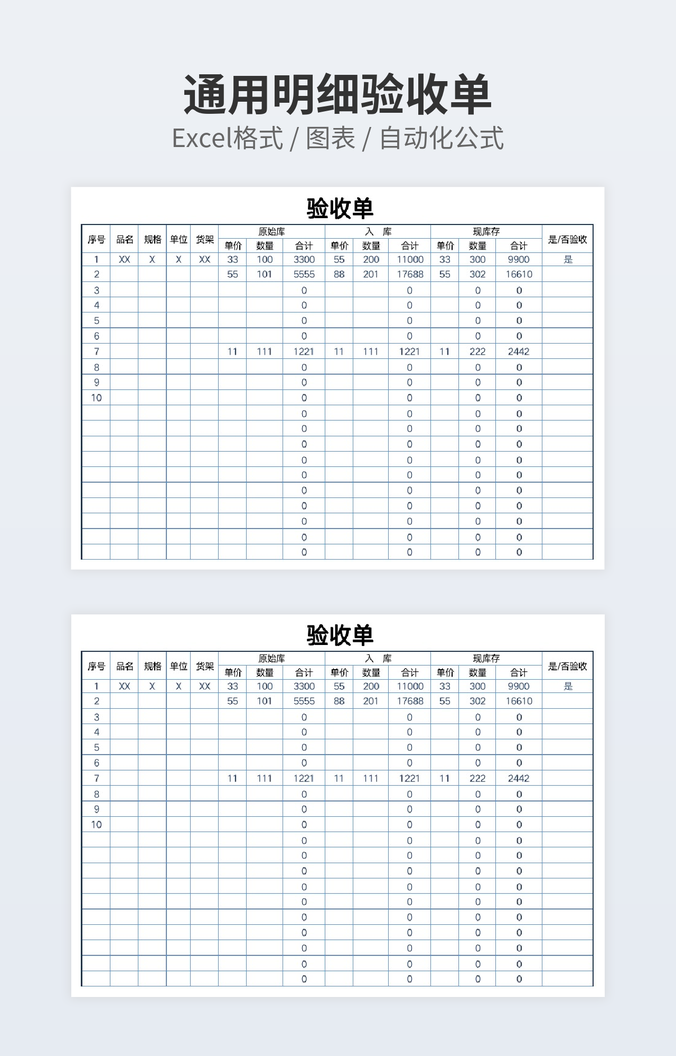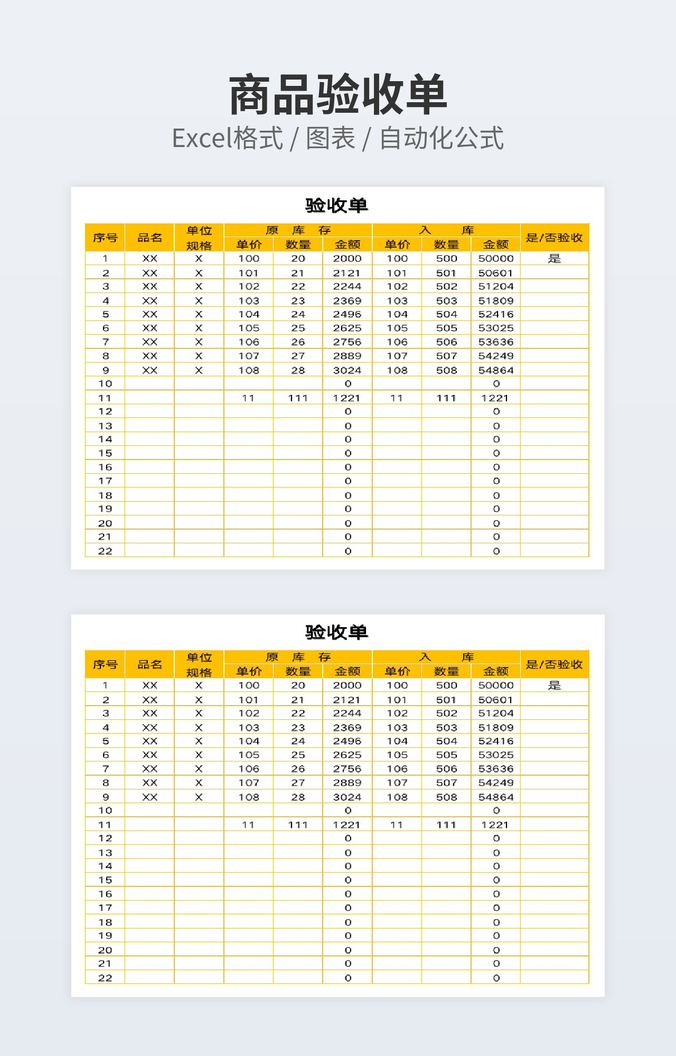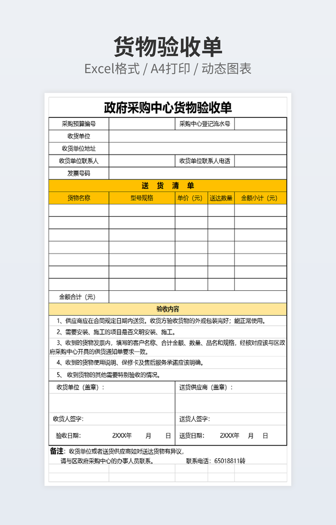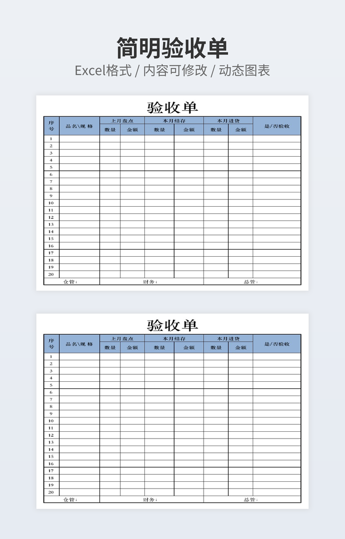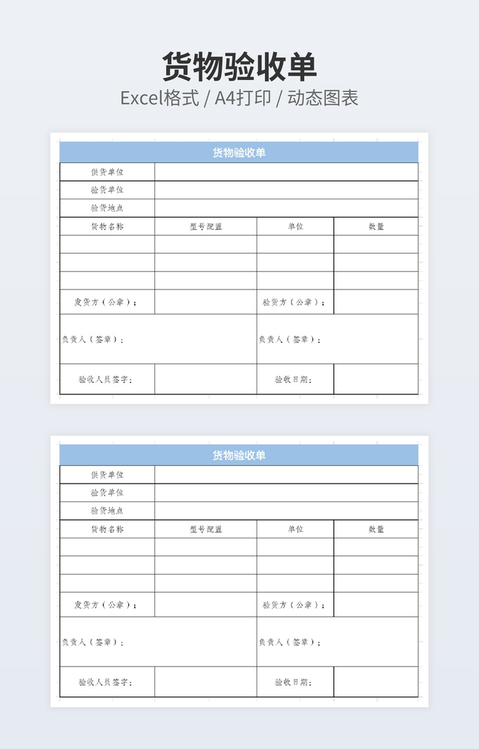 【特殊限制】设计师仅对作品中独创性部分享有著作权,对作品中含有的国旗、国徽等政治图案不享有权利,仅作为作品整体效果的示例展示,禁止商用。 相关关键词: 简洁 货物 验收 单表格 表格 优秀
