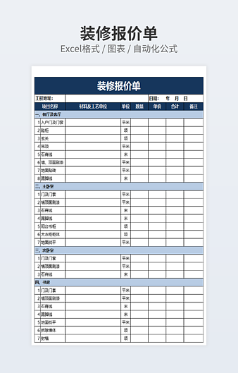 【特殊限制】设计师仅对作品中独创性部分享有著作权,对作品中含有的国旗、国徽等政治图案不享有权利,仅作为作品整体效果的示例展示,禁止商用。 相关关键词: 装修 工程预算 报价 excel 表格 模板 优秀
