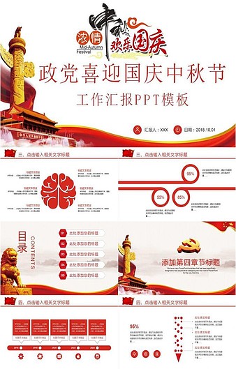 【特殊限制】设计师仅对作品中独创性部分享有著作权,对作品中含有的国旗、国徽等政治图案不享有权利,仅作为作品整体效果的示例展示,禁止商用。 相关关键词: 中秋 国庆 建国 周年庆典 PPT 模板