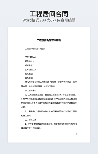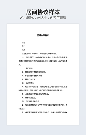 本作品内容为土地居间服务合同下载,大小为17.39KB,作品为高清大图模板,格式为docx, 属于居间合同模板,作品模板源文件下载后可用编辑替换,模板中如有人物画像仅供参考禁止商用。小Q办公网-提供简历,PPT,Word,Excel优质模板素材下载模版平台,拥有海量的工作总结、竞聘求职、年终颁奖、计划书等。 通过小Q办公网下载居间合同模板源文件编辑修改源文件文字和图片即可使用。