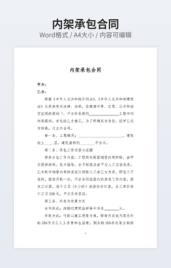 【特殊限制】设计师仅对作品中独创性部分享有著作权,对作品中含有的国旗、国徽等政治图案不享有权利,仅作为作品整体效果的示例展示,禁止商用。 相关关键词: 管道 承包 合同 模板