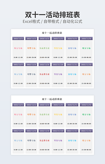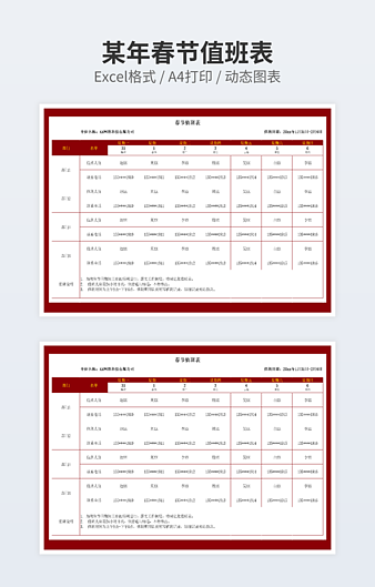 【特殊限制】设计师仅对作品中独创性部分享有著作权,对作品中含有的国旗、国徽等政治图案不享有权利,仅作为作品整体效果的示例展示,禁止商用。 相关关键词: 公司 员工 早晚 两班 排班 表格 模板