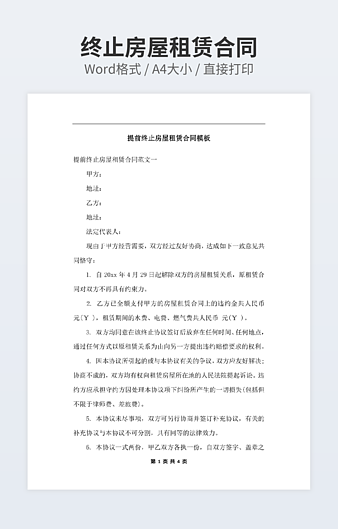【特殊限制】设计师仅对作品中独创性部分享有著作权,对作品中含有的国旗、国徽等政治图案不享有权利,仅作为作品整体效果的示例展示,禁止商用。 相关关键词: 终止 房屋租赁 合同 协议书