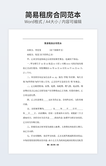 【特殊限制】设计师仅对作品中独创性部分享有著作权,对作品中含有的国旗、国徽等政治图案不享有权利,仅作为作品整体效果的示例展示,禁止商用。 相关关键词: 租房 合同 模板