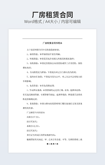 本作品内容为厂房租赁合同书下载,大小为24.19KB,作品为高清大图模板,格式为docx, 属于厂房仓库租赁模板,作品模板源文件下载后可用编辑替换,模板中如有人物画像仅供参考禁止商用。小Q办公网-提供简历,PPT,Word,Excel优质模板素材下载模版平台,拥有海量的工作总结、竞聘求职、年终颁奖、计划书等。 通过小Q办公网下载厂房仓库租赁模板源文件编辑修改源文件文字和图片即可使用。