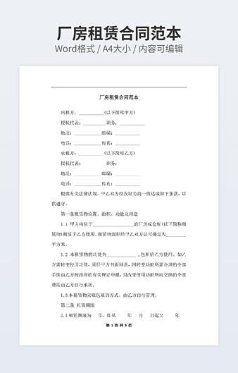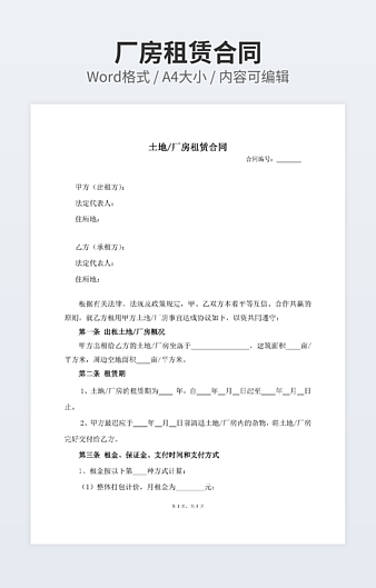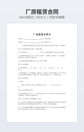 本作品内容为机械设备及厂房租赁合同下载,大小为55KB,作品为高清大图模板,格式为doc, 属于厂房仓库租赁模板,作品模板源文件下载后可用编辑替换,模板中如有人物画像仅供参考禁止商用。小Q办公网-提供简历,PPT,Word,Excel优质模板素材下载模版平台,拥有海量的工作总结、竞聘求职、年终颁奖、计划书等。 通过小Q办公网下载厂房仓库租赁模板源文件编辑修改源文件文字和图片即可使用。