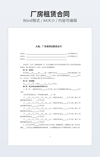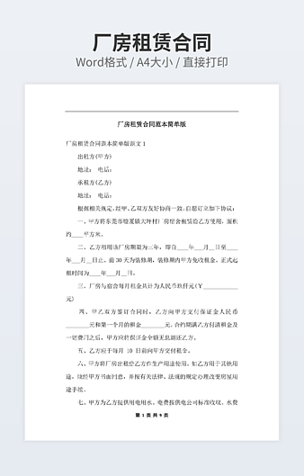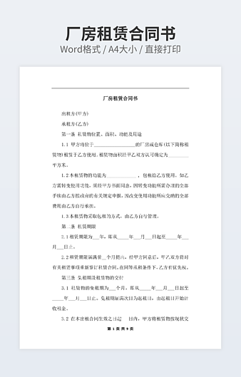 【特殊限制】设计师仅对作品中独创性部分享有著作权,对作品中含有的国旗、国徽等政治图案不享有权利,仅作为作品整体效果的示例展示,禁止商用。 相关关键词: 标准 厂房 租赁 合同范本 模板