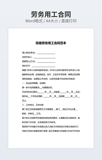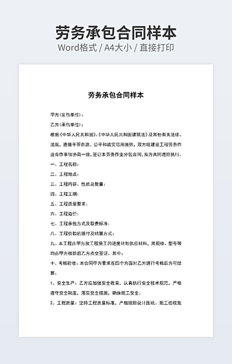 本作品内容为劳务合同样本下载,大小为26.33KB,作品为高清大图模板,格式为docx, 属于劳务合同模板,作品模板源文件下载后可用编辑替换,模板中如有人物画像仅供参考禁止商用。小Q办公网-提供简历,PPT,Word,Excel优质模板素材下载模版平台,拥有海量的工作总结、竞聘求职、年终颁奖、计划书等。 通过小Q办公网下载劳务合同模板源文件编辑修改源文件文字和图片即可使用。