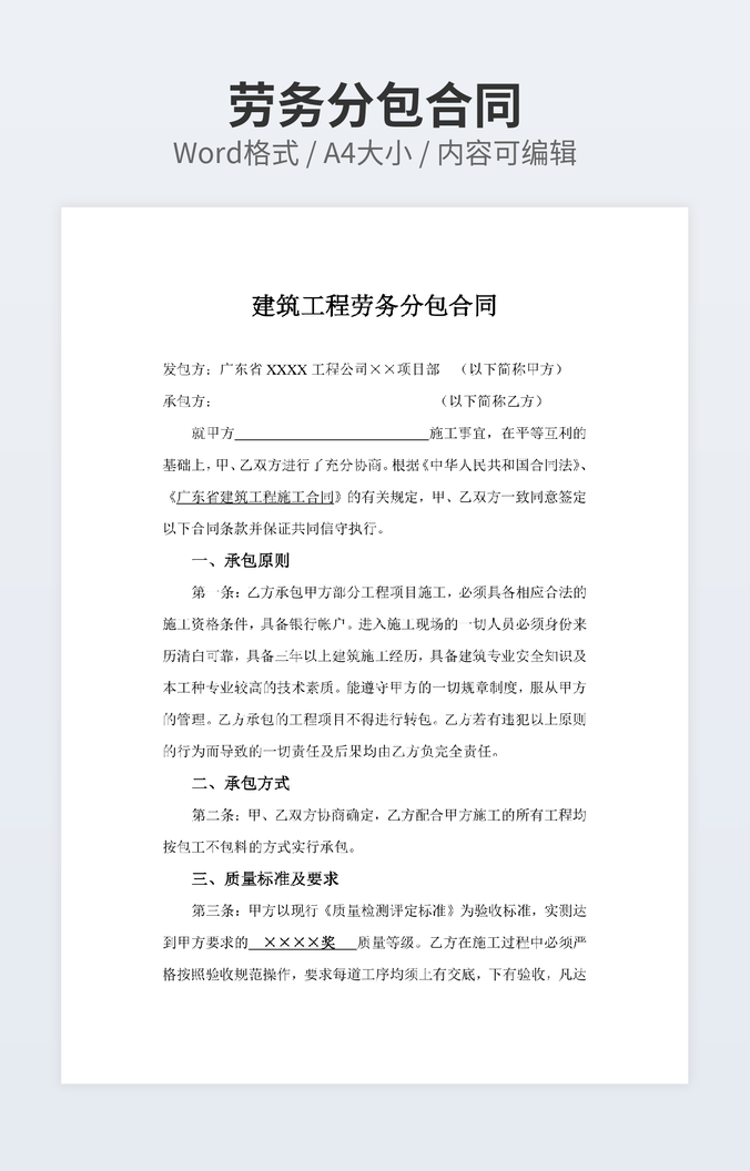【特殊限制】设计师仅对作品中独创性部分享有著作权,对作品中含有的国旗、国徽等政治图案不享有权利,仅作为作品整体效果的示例展示,禁止商用。 相关关键词: 劳务合同 合同 大全 国际 中外