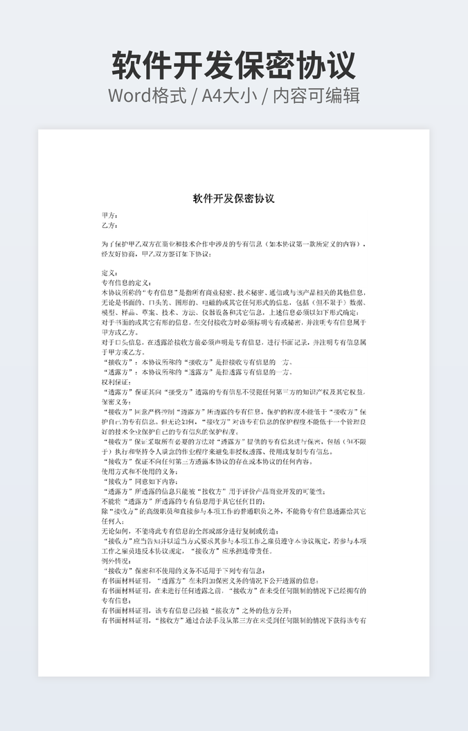 本作品内容为保密协议范本(简要版)下载,大小为30KB,作品为高清大图模板,格式为doc, 属于保密协议模板,作品模板源文件下载后可用编辑替换,模板中如有人物画像仅供参考禁止商用。小Q办公网-提供简历,PPT,Word,Excel优质模板素材下载模版平台,拥有海量的工作总结、竞聘求职、年终颁奖、计划书等。 通过小Q办公网下载保密协议模板源文件编辑修改源文件文字和图片即可使用。