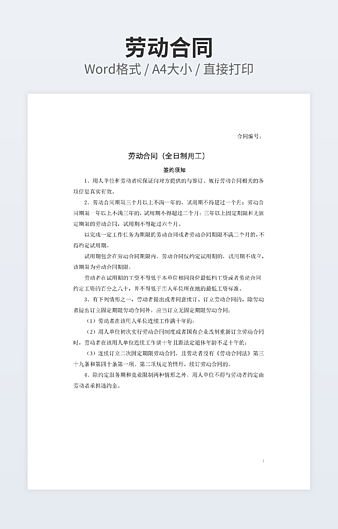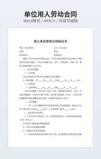 【特殊限制】设计师仅对作品中独创性部分享有著作权,对作品中含有的国旗、国徽等政治图案不享有权利,仅作为作品整体效果的示例展示,禁止商用。 相关关键词: 淘宝 劳动合同