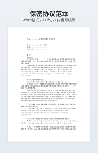 本作品内容为中英文保密协议范本下载,大小为85.5KB,作品为高清大图模板,格式为doc, 属于保密协议模板,作品模板源文件下载后可用编辑替换,模板中如有人物画像仅供参考禁止商用。小Q办公网-提供简历,PPT,Word,Excel优质模板素材下载模版平台,拥有海量的工作总结、竞聘求职、年终颁奖、计划书等。 通过小Q办公网下载保密协议模板源文件编辑修改源文件文字和图片即可使用。