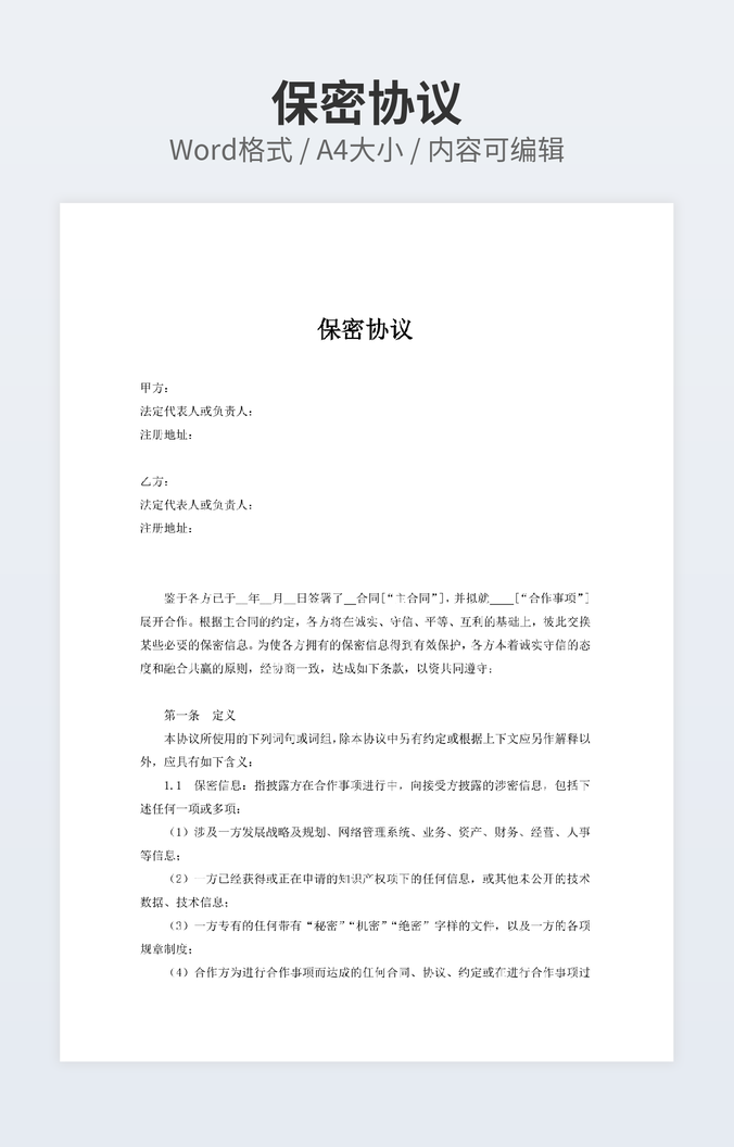 本作品内容为保密协议下载,大小为38.5KB,作品为高清大图模板,格式为doc, 属于保密协议模板,作品模板源文件下载后可用编辑替换,模板中如有人物画像仅供参考禁止商用。小Q办公网-提供简历,PPT,Word,Excel优质模板素材下载模版平台,拥有海量的工作总结、竞聘求职、年终颁奖、计划书等。 通过小Q办公网下载保密协议模板源文件编辑修改源文件文字和图片即可使用。