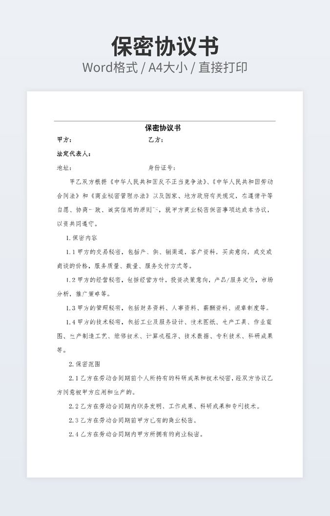 【特殊限制】设计师仅对作品中独创性部分享有著作权,对作品中含有的国旗、国徽等政治图案不享有权利,仅作为作品整体效果的示例展示,禁止商用。 相关关键词: 保密 协议