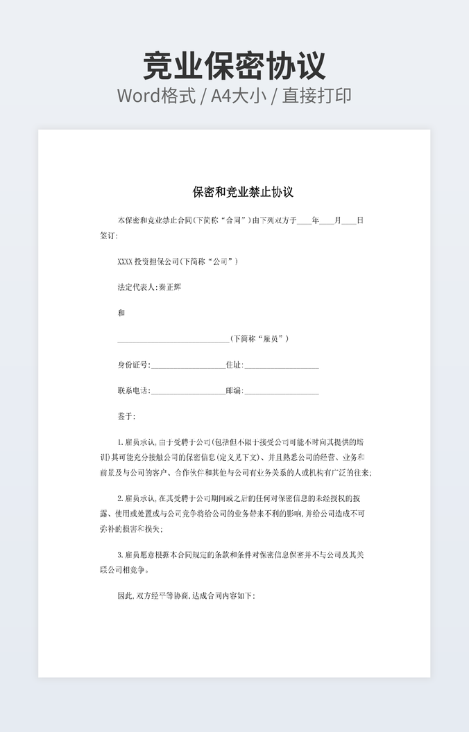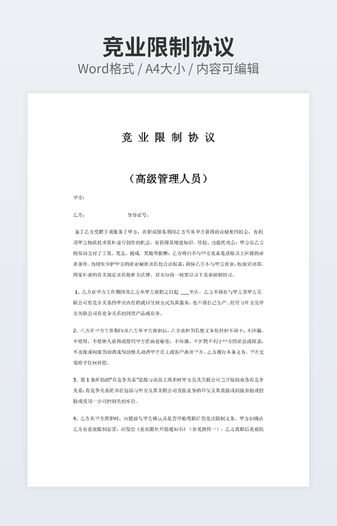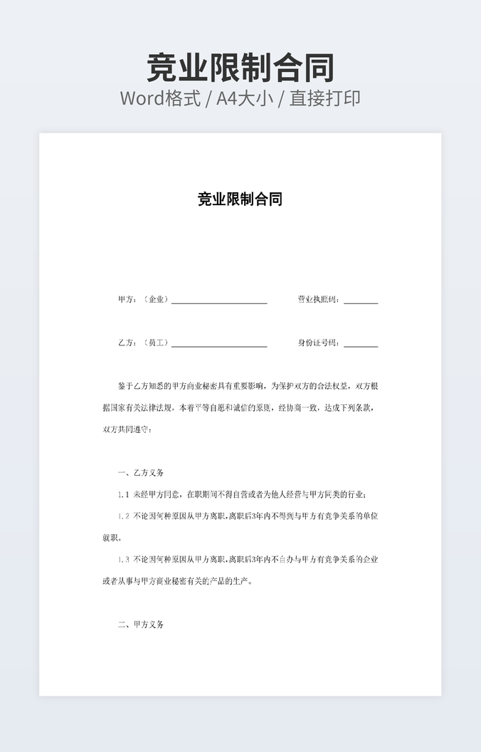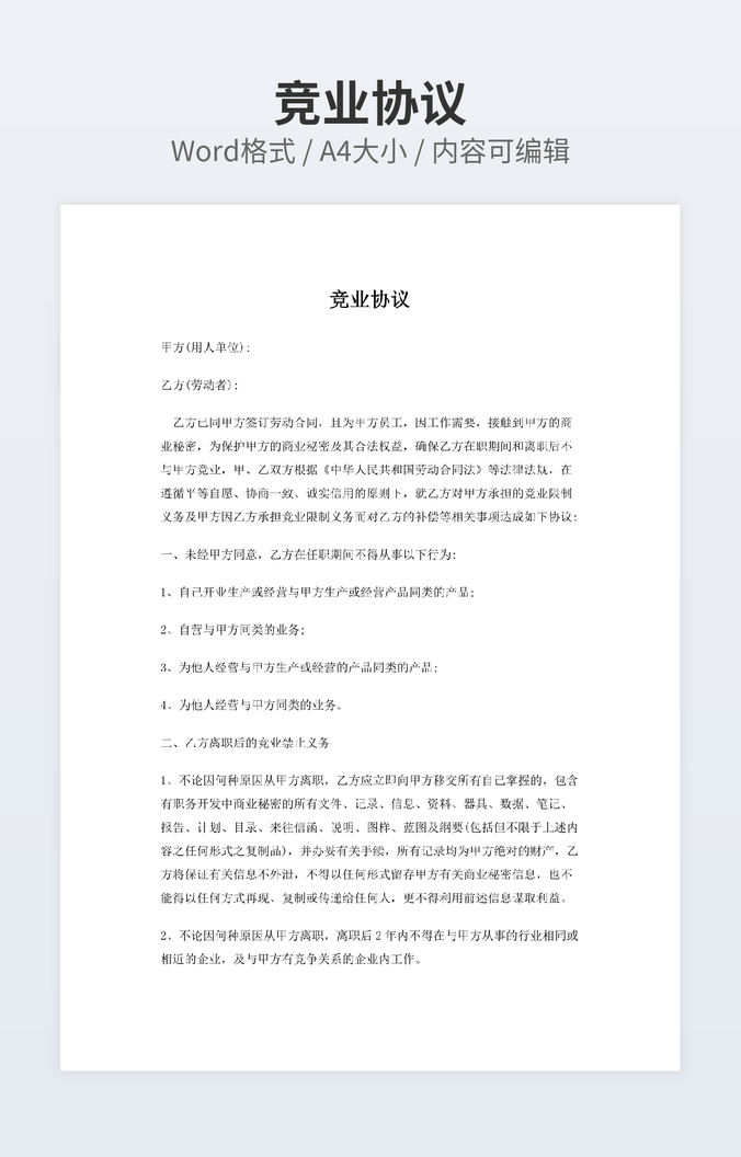 本作品内容为停工补偿合同协议下载,大小为25.5KB,作品为高清大图模板,格式为doc, 属于竞业协议模板,作品模板源文件下载后可用编辑替换,模板中如有人物画像仅供参考禁止商用。小Q办公网-提供简历,PPT,Word,Excel优质模板素材下载模版平台,拥有海量的工作总结、竞聘求职、年终颁奖、计划书等。 通过小Q办公网下载竞业协议模板源文件编辑修改源文件文字和图片即可使用。
