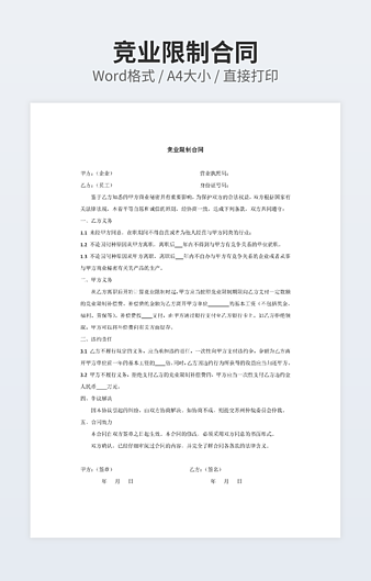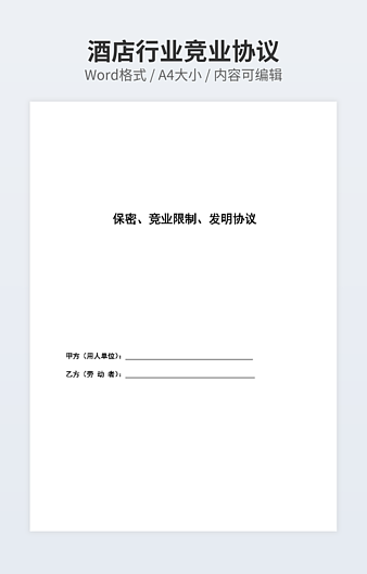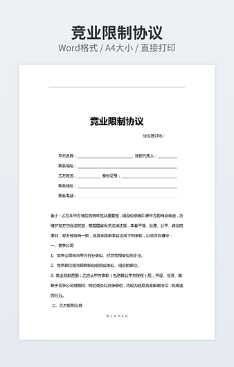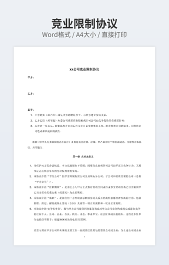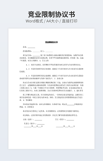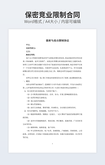 【特殊限制】设计师仅对作品中独创性部分享有著作权,对作品中含有的国旗、国徽等政治图案不享有权利,仅作为作品整体效果的示例展示,禁止商用。 相关关键词: 竞业 协议 模板