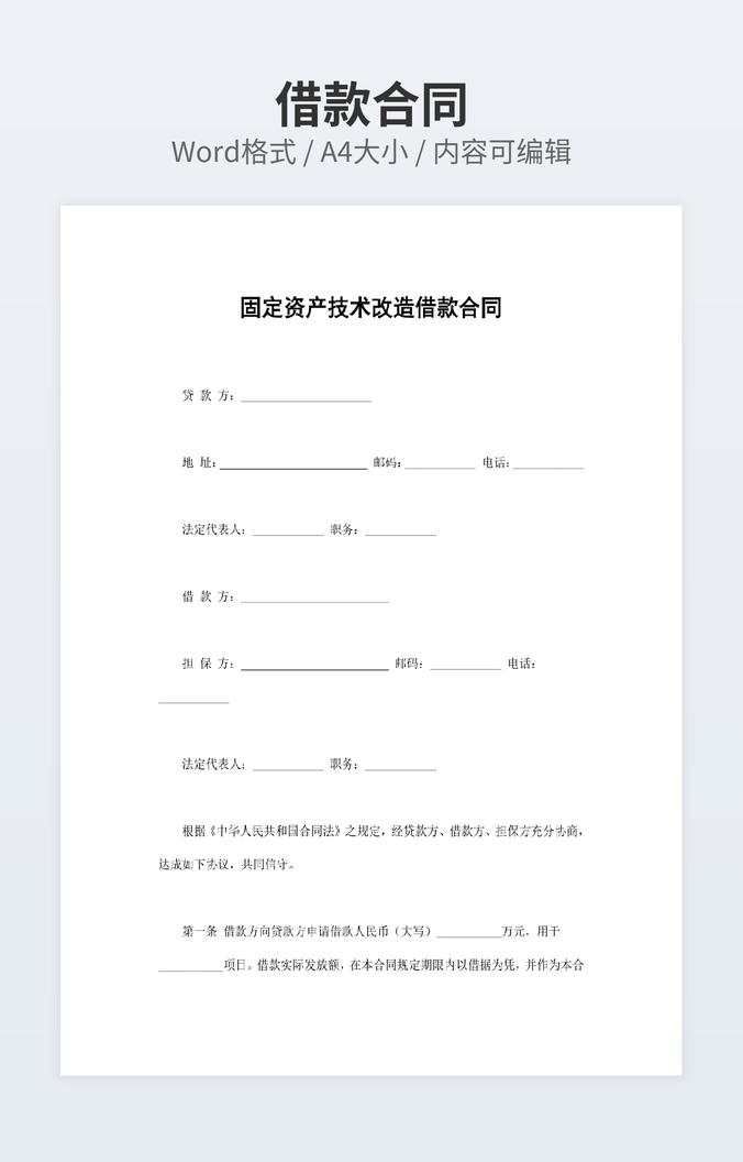 本作品内容为人民币贷款合同下载,大小为15.99KB,作品为高清大图模板,格式为docx, 属于贷款合同模板,作品模板源文件下载后可用编辑替换,模板中如有人物画像仅供参考禁止商用。小Q办公网-提供简历,PPT,Word,Excel优质模板素材下载模版平台,拥有海量的工作总结、竞聘求职、年终颁奖、计划书等。 通过小Q办公网下载贷款合同模板源文件编辑修改源文件文字和图片即可使用。
