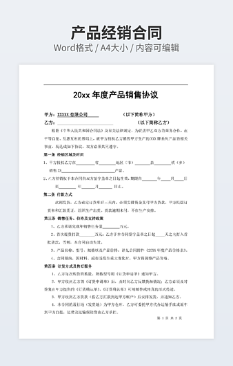 本作品内容为产品经销合同 (买卖合同)下载,大小为38KB,作品为高清大图模板,格式为doc, 属于经销合同模板,作品模板源文件下载后可用编辑替换,模板中如有人物画像仅供参考禁止商用。小Q办公网-提供简历,PPT,Word,Excel优质模板素材下载模版平台,拥有海量的工作总结、竞聘求职、年终颁奖、计划书等。 通过小Q办公网下载经销合同模板源文件编辑修改源文件文字和图片即可使用。