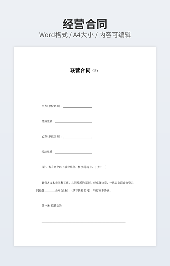 本作品内容为租赁经营合同书范文下载,大小为29KB,作品为高清大图模板,格式为doc, 属于经营合同模板,作品模板源文件下载后可用编辑替换,模板中如有人物画像仅供参考禁止商用。小Q办公网-提供简历,PPT,Word,Excel优质模板素材下载模版平台,拥有海量的工作总结、竞聘求职、年终颁奖、计划书等。 通过小Q办公网下载经营合同模板源文件编辑修改源文件文字和图片即可使用。