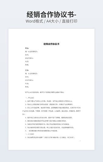 本作品内容为产品经销合同下载,大小为39KB,作品为高清大图模板,格式为doc, 属于经销合同模板,作品模板源文件下载后可用编辑替换,模板中如有人物画像仅供参考禁止商用。小Q办公网-提供简历,PPT,Word,Excel优质模板素材下载模版平台,拥有海量的工作总结、竞聘求职、年终颁奖、计划书等。 通过小Q办公网下载经销合同模板源文件编辑修改源文件文字和图片即可使用。