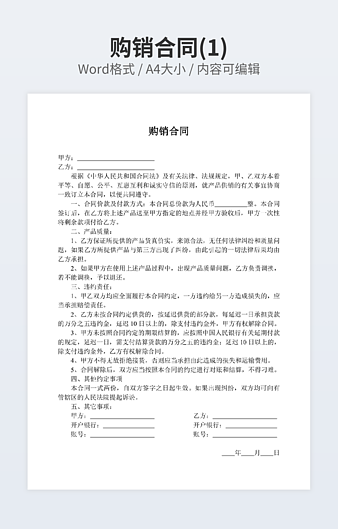 本作品内容为购销合同下载,大小为35KB,作品为高清大图模板,格式为doc, 属于购销合同模板,作品模板源文件下载后可用编辑替换,模板中如有人物画像仅供参考禁止商用。小Q办公网-提供简历,PPT,Word,Excel优质模板素材下载模版平台,拥有海量的工作总结、竞聘求职、年终颁奖、计划书等。 通过小Q办公网下载购销合同模板源文件编辑修改源文件文字和图片即可使用。