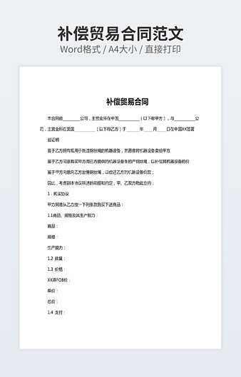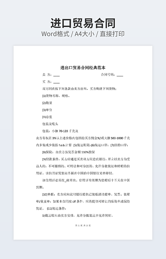 本作品内容为国际贸易合同样本下载,大小为23.02KB,作品为高清大图模板,格式为docx, 属于进出口贸易模板,作品模板源文件下载后可用编辑替换,模板中如有人物画像仅供参考禁止商用。小Q办公网-提供简历,PPT,Word,Excel优质模板素材下载模版平台,拥有海量的工作总结、竞聘求职、年终颁奖、计划书等。 通过小Q办公网下载进出口贸易模板源文件编辑修改源文件文字和图片即可使用。