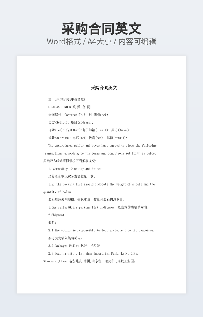 本作品内容为进出口贸易合同下载,大小为16.63KB,作品为高清大图模板,格式为docx, 属于进出口贸易模板,作品模板源文件下载后可用编辑替换,模板中如有人物画像仅供参考禁止商用。小Q办公网-提供简历,PPT,Word,Excel优质模板素材下载模版平台,拥有海量的工作总结、竞聘求职、年终颁奖、计划书等。 通过小Q办公网下载进出口贸易模板源文件编辑修改源文件文字和图片即可使用。