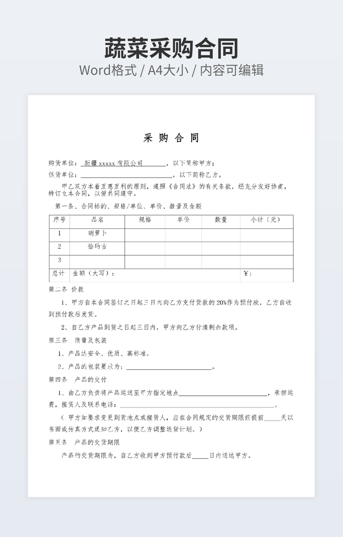 本作品内容为电子元件配件采购合同模板下载,大小为20.78KB,作品为高清大图模板,格式为docx, 属于采购合同模板,作品模板源文件下载后可用编辑替换,模板中如有人物画像仅供参考禁止商用。小Q办公网-提供简历,PPT,Word,Excel优质模板素材下载模版平台,拥有海量的工作总结、竞聘求职、年终颁奖、计划书等。 通过小Q办公网下载采购合同模板源文件编辑修改源文件文字和图片即可使用。