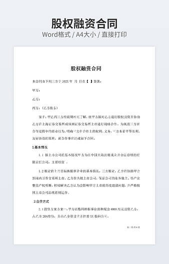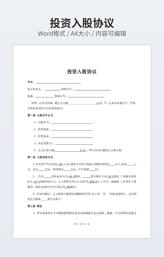 【特殊限制】设计师仅对作品中独创性部分享有著作权,对作品中含有的国旗、国徽等政治图案不享有权利,仅作为作品整体效果的示例展示,禁止商用。 相关关键词: 私募 股权 投资 基金投资 增资 扩股 协议